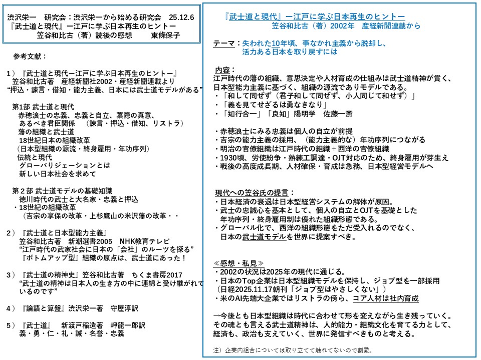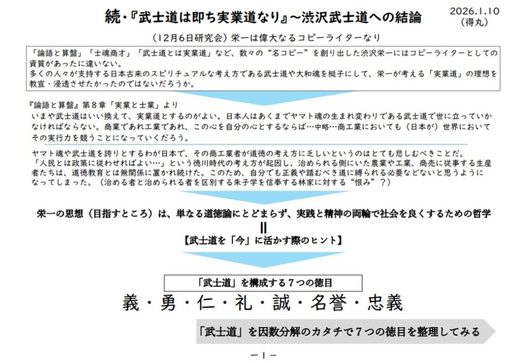 | 研究テーマ | ①「武士道と現代」―江戸に学ぶ日本再生のヒントー(笠谷和比古)書籍紹介 ② 続・「武士道は即ち実業道なり」~渋沢武士道への結論 |
