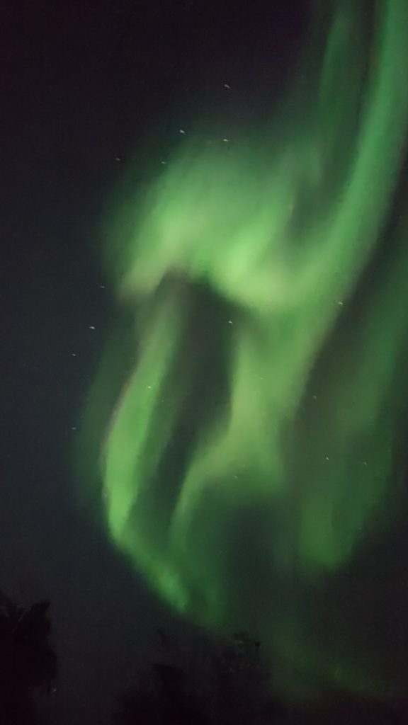 23時頃からオーロラ観賞に出発。鉱山近くの広場にあるキャビンで休憩を取りながら待機。夜中過ぎから少しオーロラが見え始め、オーロラを背景に集合写真を撮影。ツアーに参加して分かったことは、オーロラは肉眼では白っぽく見えることが多いが、感度の良いカメラで写すと緑や紫、青などの色が判別でき、見え方が違う。TVや映像で観るオーロラはさらに高感度カメラでベストショットを撮影しているので、素人が頑張ってみてもその違いは歴然としている。周囲で山火事があったりするとオーロラはまったく見えず、太陽の地磁気の強さによっても見えないことも多いので、オーロラ観賞ツアーは運不運があることを自覚しておくべきである。ツアー仲間で作ったライングループの名は「あきらめない会」と命名した。