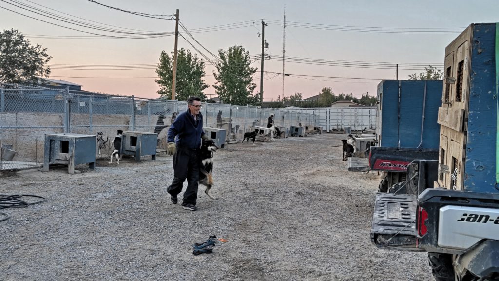 4日目の午後は町の郊外にあるグラント氏が経営する犬ぞりの訓練施設 Beck’s Kennels を見学。150頭のアラスカン・ハスキーを飼育している。1600kmの超絶レースに耐える犬に求められるのは、血統とトレーニング、そして餌(餌代年間2000~3000万円)。犬は生後まもなくしてから、犬ぞりのどのポジションが適しているのかをグラント氏が判断し、1頭ごとに餌を変えた個別トレーニングを行っている。雪のない時期は、専用のジープを犬たちがけん引するように、運転スピードを合わせたトレーニングを行い、犬同士の連携を確かめている。犬小屋に立ち寄ると、犬たちは一斉に大声で吠えはじめ、我先に「訓練に連れてって!」とグラント氏にラブコールをするのにビックリ!我々もグループに分かれて訓練車から元気な犬たちの活躍を体験できた。