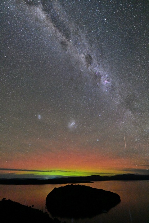 最初は澄んだ空気と雄大な自然の写真を撮るのが目的でしたが、この数年時期をずらし星やオーロラも撮るようになりました、日本の本州北部から北海道に相当する緯度で、南半球では南極大陸と南アメリカ大陸南端以外でオーロラが良く見える陸地です。ニュージーランドで見えるのは、大きなオーロラの上部を見ているいわゆる低緯度オーロラと呼ばれるもので、赤が中心でその下に少し緑が見えます。空気がきれいで光害の少ないニュージーランドでは星もよく見え、天の川とオーロラの共演にもしばしば遭遇します。昨年念願の南島のさらに南のスチュワート島に行くことが出来、雄大な天の川、オーロラと流れ星の三者共演も撮ることが出来ました。