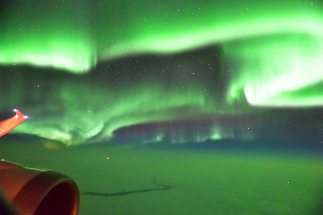 北極圏の南縁を飛ぶヨーロッパ→日本便は絶好のオーロラ撮影のチャンスでした。ほとんどが夜行便で1万メートル以上の上空では雲にさえぎられることもなく、オーロラさえ出ていれば必ず見ることが出来ました。そのチャンスがあるときはA席(進行左=北側)を取り、窓の映り込みを防ぐ飛行機窓用忍者レフを準備し、出発直後からオーロラの様子を観察し続けます。