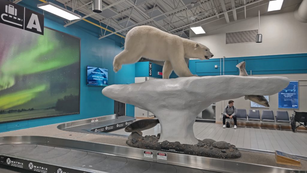 イエローナイフ空港の壁に素晴らしいオーロラの風景写真が掲げられていたので、それと同様のオーロラが観れるのでは?と皆の期待感が高まった。イエローナイフは1930年代からゴールドラッシュで栄えたが、1990年代以降はダイヤモンドが発見され、世界有数のダイヤモンド鉱山となり、そこで働く頑強な体形の先住民達を町で多く見かけた。