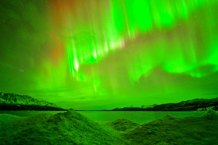 カナダの最高峰 Mt.Logan(5,959m)のあるクルアニ国立公園に隣接した山、氷河、湖と起伏に富んだ雄大な自然が魅力です。吹き寄せられた氷が岸辺に山をなし、全面結氷した湖の上に出たオーロラは圧巻です。湖のほとりのロッジで暖を取りながら待機して、誰かが「オーロラが出たぞ!」と叫ぶと一斉に飛び出して撮影にかかりました。 -20℃位まで下がりましたが、寒くなるとロッジで暖を取れるのは楽でした。