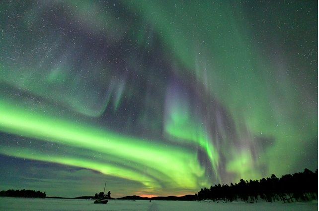 暗くなってから待つこと2時間近く、あきらめかけていたオーロラが見え始めた。ボートで湖の波止場に帰る途中、天空に舞い降りてきたような鮮やかなオーロラが空全体に現われ、全員大騒ぎ! ソファ付きボートで寝ころびながら、30分ほど真夜中のオーロラショーを満喫した。
