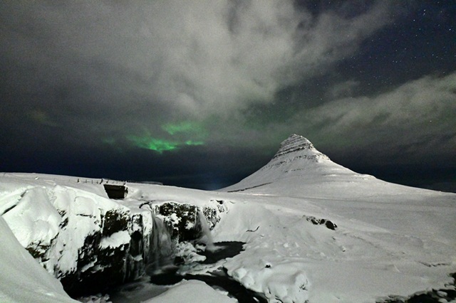 メキシコ湾流の影響で北極圏にありながら沿岸部は冬でも-5℃を下回ることが少ないアイスランドは、移動、撮影が楽です。大きな氷河でおおわれている一方、火山活動も活発で冬も凍ることのない川が作った大きな滝は雄大です。比較的新しい島でその地形は若く、独特です。夜間滝の近くは危険なので、滝にかかるオーロラはあきらめ、氷河や雪山にかかるオーロラに集中しました。狙っていたとんがり帽子の山「キルクユッフェル」に出たオーロラは「ちょっとだけよ」と言って消えてしまいました。