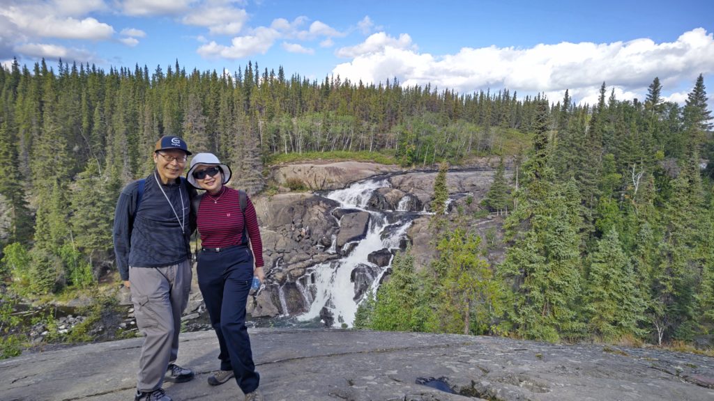 3日目の午後は有名なキャメロン滝へのハイキングに参加。途中、トウヒ雷鳥やリス、ビーバーの巣や潜水が得意な鳥アビも見ることができた。