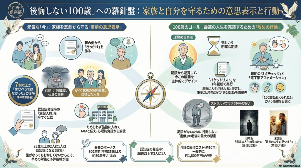 しかし、この「死なない時間」は、戦略なき者にとっては「空虚な長寿」という名の呪縛になり得ます。私たちはこの膨大な時間を、いかにして知的な充足と自己肯定に満ちた「最高の人生」へと昇華させるべきか。本レポートでは、百寿倶楽部が提示する、不確実な未来を生き抜くための「戦略的羅針盤」を詳述します。
