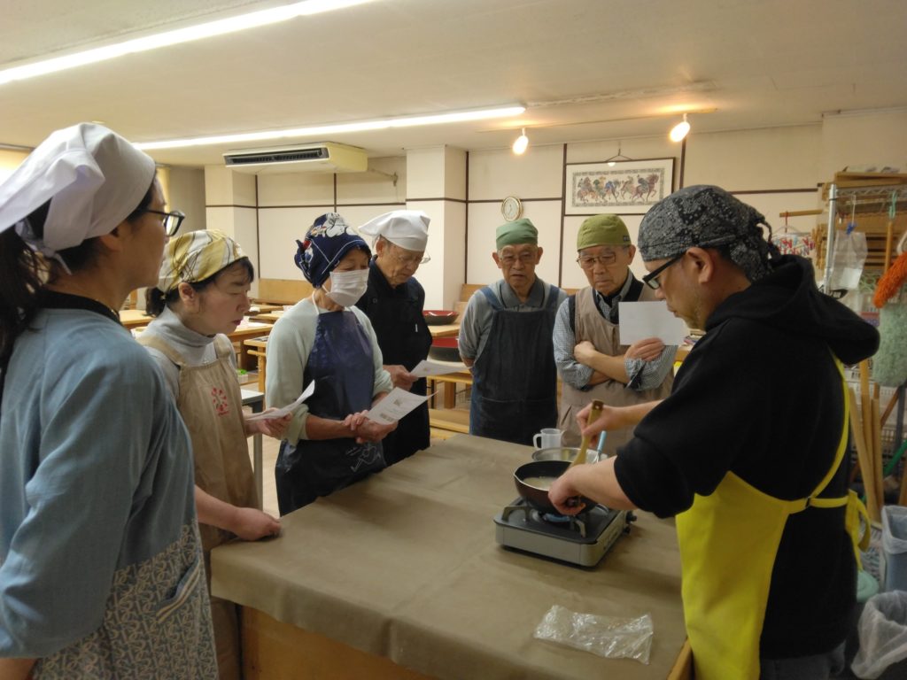 3月27日(金)に玄庵にて蕎麦道場が行われました。いつもは蕎麦打ちの前に前田先生によるお手本をお願いしていますが、今回は「蕎麦がき」の作り方をお願いしました。「蕎麦がき」はあっという間に出来上がり、参加者全員で試食をしてから蕎麦打ちに入りました。